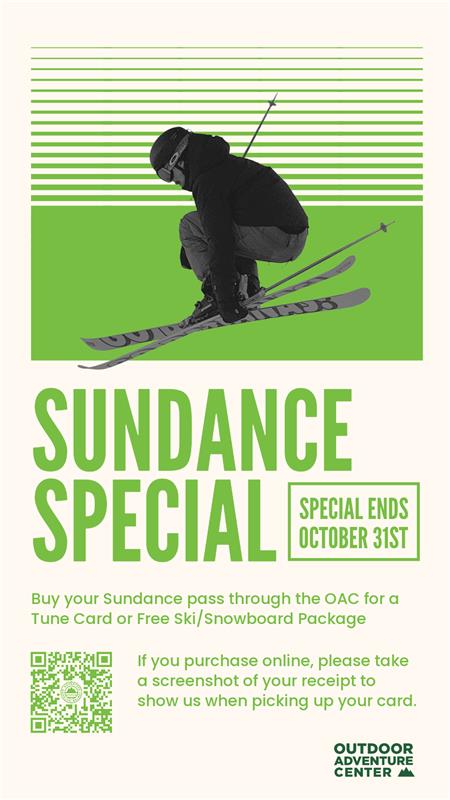 Buy your Sundance Pass through the Outdoor Adventure Center (OAC) for a Tune Card or Free Ski/Snowboard Rental Package.