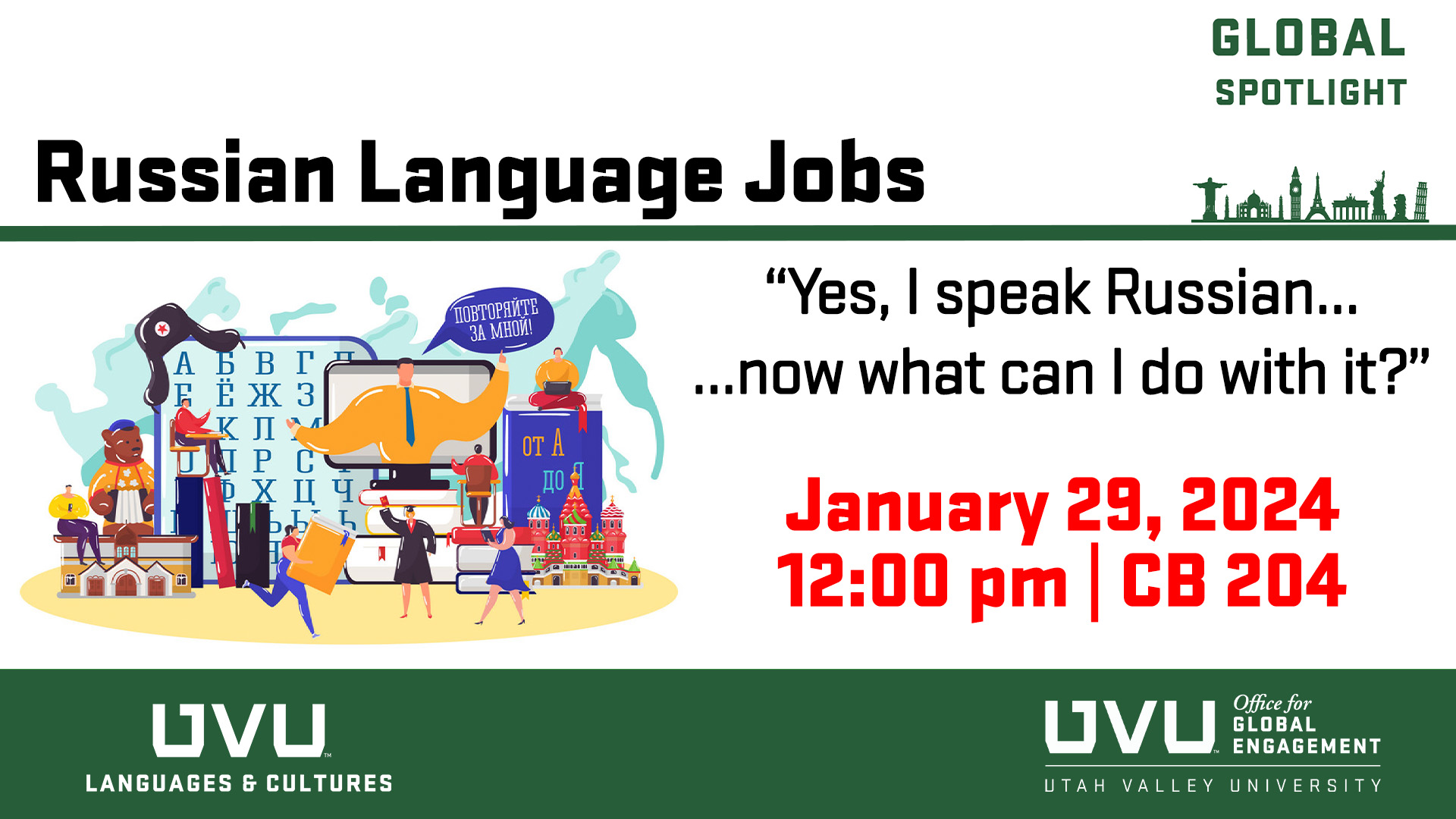 This Global Spotlight event was a collaboration with the Russian Language Program in the Department of Languages & Cultures. Dr. Fred White and Amy Barnett (from the Office for Global Engagement) shared their expreiences using thier Russian language skills in a variety of jobs and volunteer positions. It was great opportunity for UVU students to ask questions and get career ideas. There was an assortment of Russian treats to sample, as well.