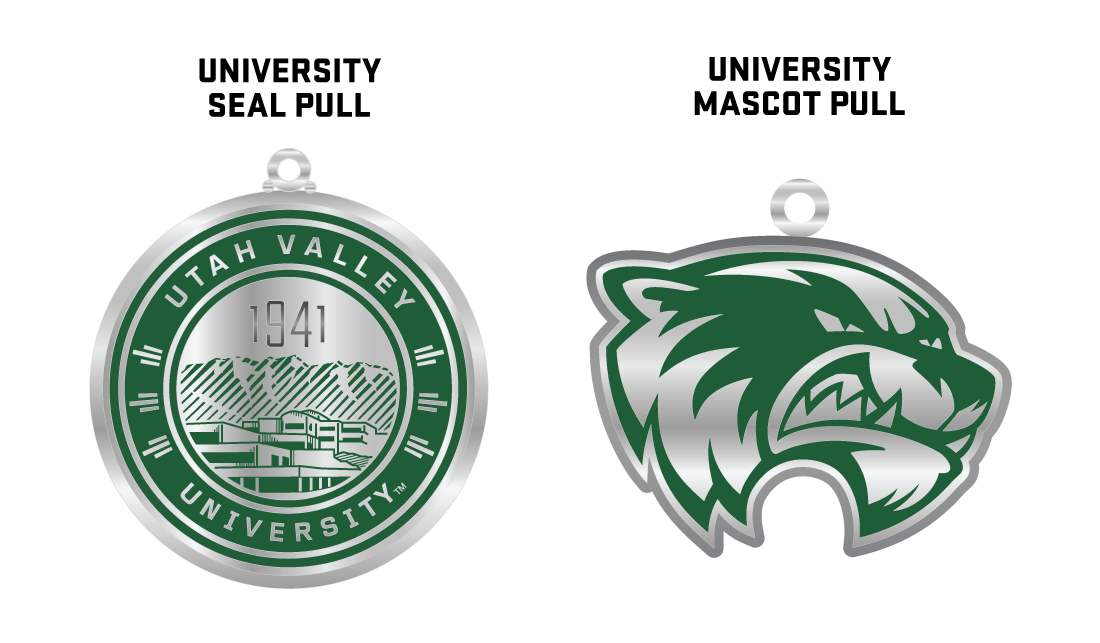 Silver-toned enamel, metal regalia zipper pull featuring full-color UVU Seal or Mascot