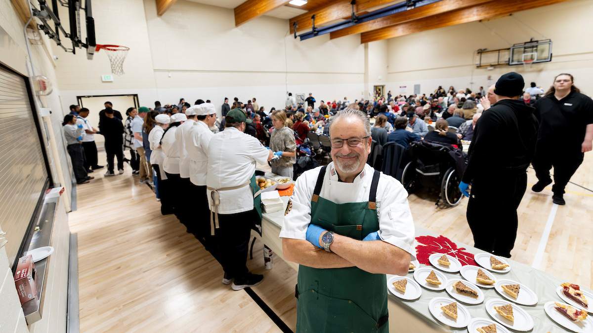 More than 300 community members lined up at Salt Lake City’s Central City Recreation Center on November 25, 2025 for a free Thanksgiving meal prepared and served by students and faculty from Utah Valley University’s Culinary Arts Institute. Salt Lake County Parks and Recreation has hosted this dinner for 30 years, and this year marks UVU’s 12th year preparing and serving the full holiday meal.