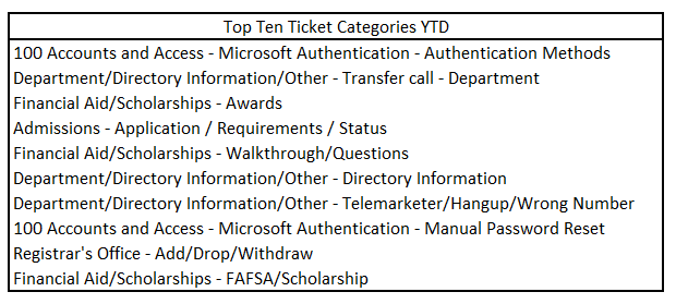 • Each time someone contacts the Service Desk, regardless of the type of contact, a ticket is made that describes the type of question the interaction was about. This lists the top ten types of questions we’ve answered so far this year.