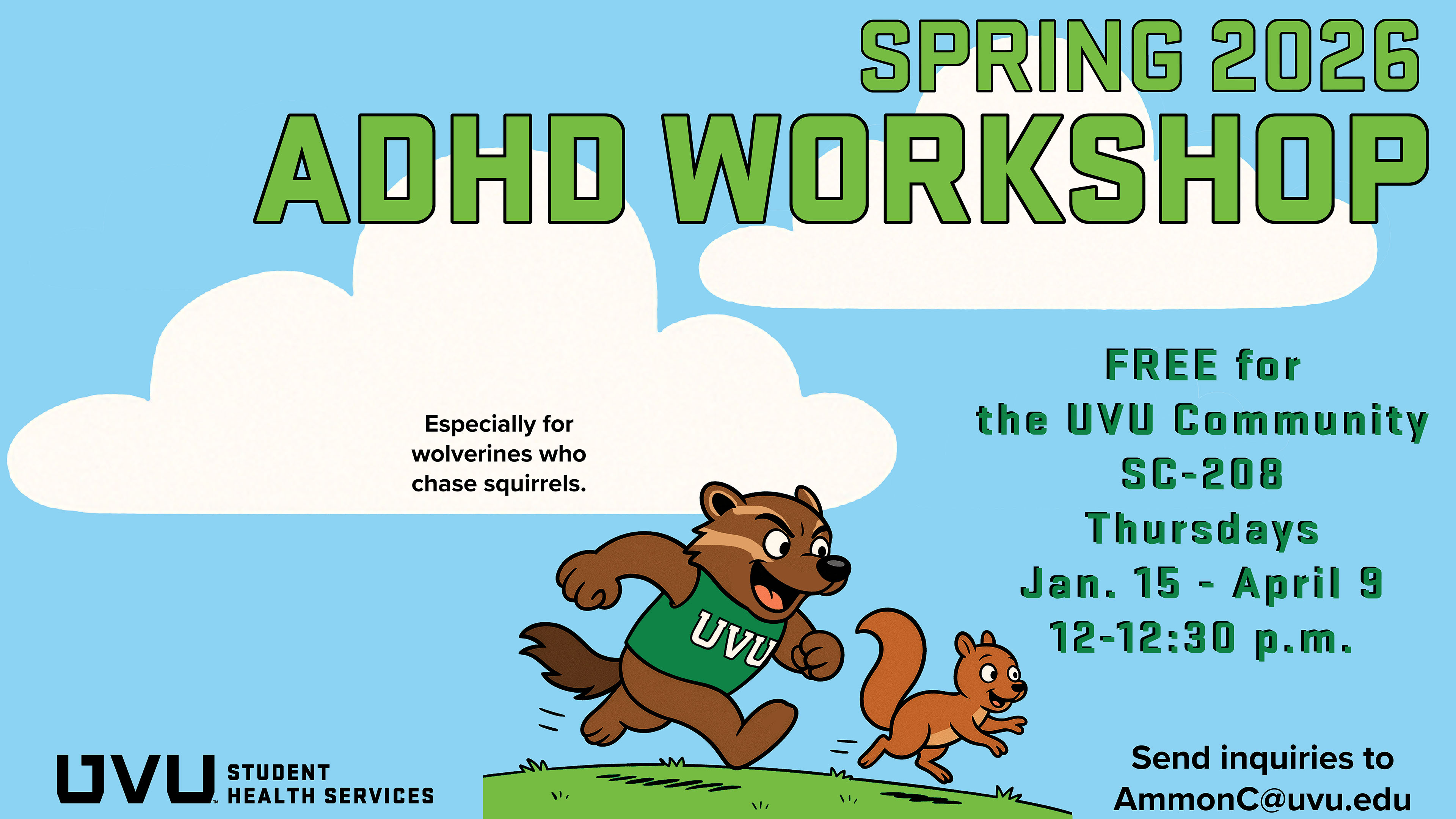 Regardless of where you are in the testing process, you are welcome to attend the ADHD Workshop. The ADHD Workshop for Spring 2026 will be held in SC-208, January 15 through April 9. Feel free to contact Dr. Ammon Cheney ([email protected]) if you have any questions. Open to the UVU Community, these psychoeducational workshops are focused on understanding ADHD and managing distractive symptoms for individuals with or without a diagnosis of ADHD. This series of workshops will provide entry-level information as well as symptom management skills. Intended for audience members either who experience distractive symptoms or who function in a role where understanding distraction is helpful. Attendance is free and no registration is required. Attend each workshop or attend only the session(s) that fit your interest and schedule. Topics for each session will be posted weekly on SHS’s Instagram account. |