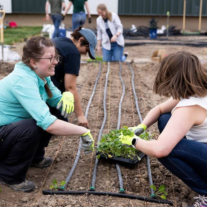 ⠀![]() Volunteers plant seedlings and install irrigation lines in the GRIT Garden. |