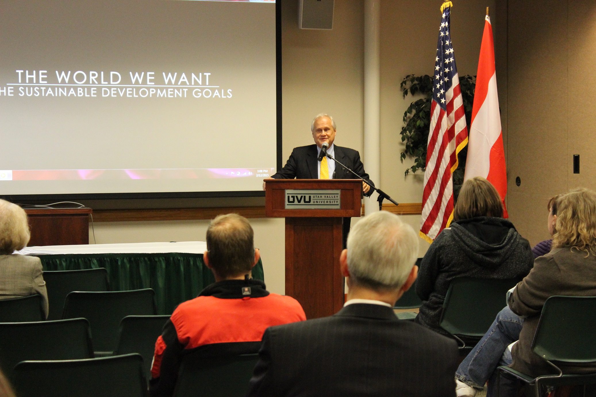 The lecture by Ambassador Martin Sajdik, Permanent Representative of Austria to the United Nations gave insight in to the United Nation’s Sustainable Development Goals, the goals are a result of the move to adopt the post-2015 development agenda by the General Assembly. Ambassador Sajdik, is President of the Economic and Social Council, a fifty-four government member organization whose key responsibilities are to review and make recommendations to the United Nations for sustainable development goals. Distinguished guest made a presentation before the faculty and students at UVU on Thursday, February 12, 2015 at the Sorensen Center of Utah Valley University. Title of his presentation was “A new global strategy for sustainability; the post 2015 development agenda of the United Nations – will it make a difference?”