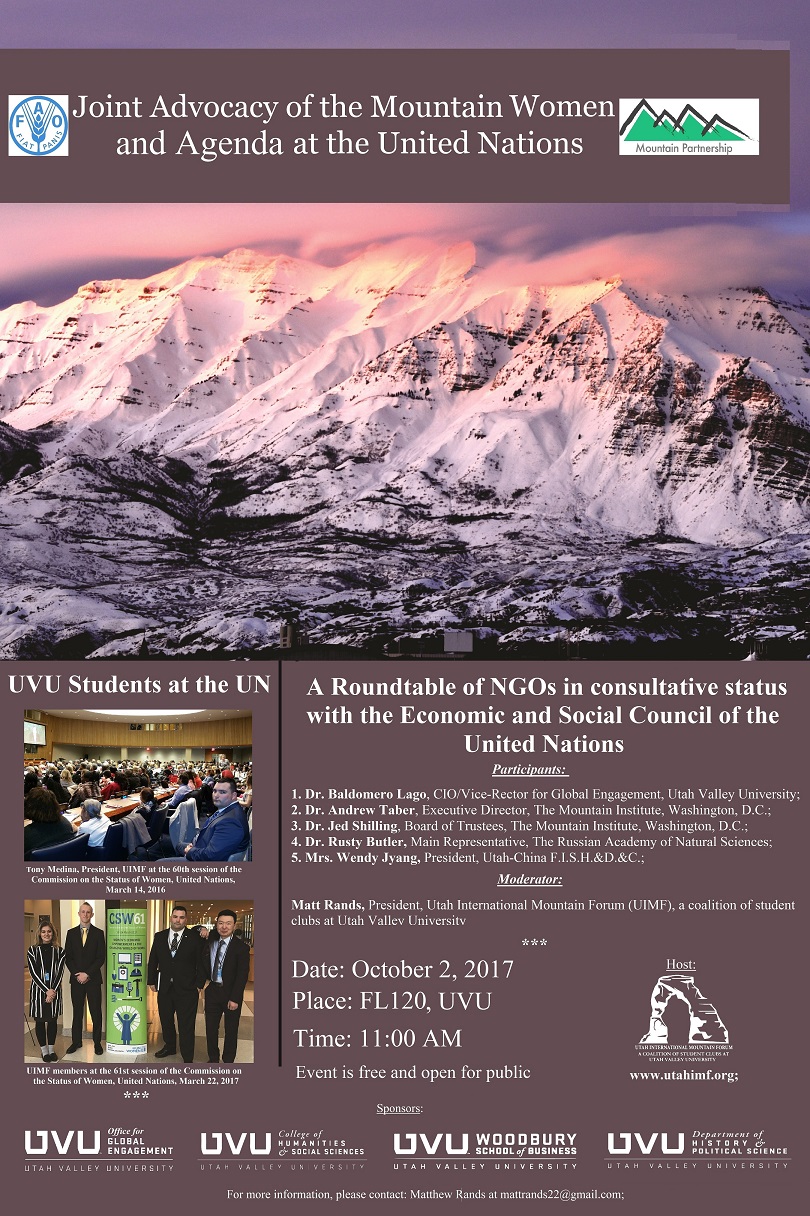 The Utah International Mountain Forum (UIMF), a coalition of student clubs at Utah Valley University (UVU) hosted representatives of several NGOs in consultative status with the UN Economic and Social Council (ECOSOC) for brainstorming sessions on October 2nd, 2017. Main discussions took place during a round table titled: “Joint Advocacy of Mountain Women and Agenda at the United Nations.”