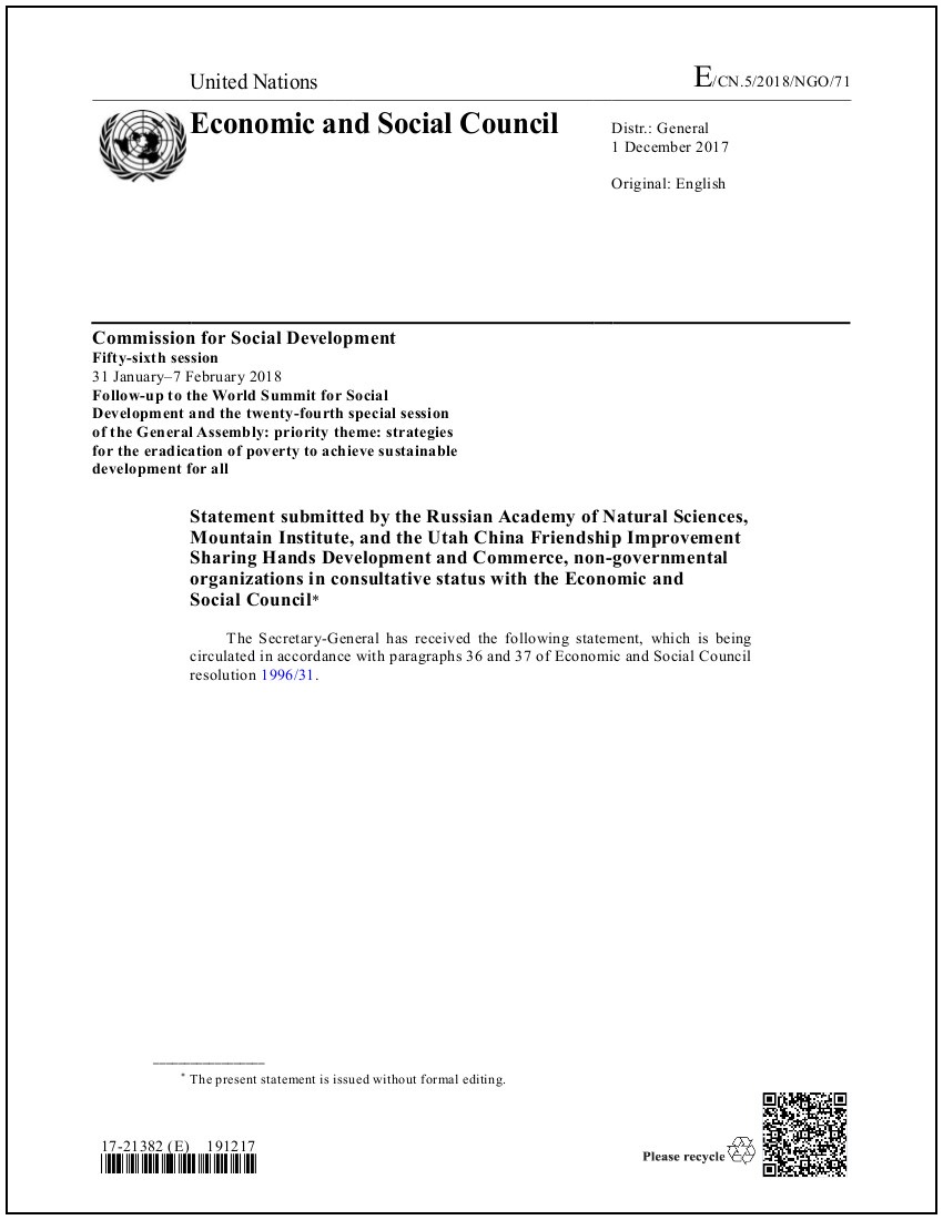 Three non-governmental organizations in consultative status with the Economic and Social Council of the United Nations, the Russian Academy of Natural Sciences, the Mountain Institute, and Utah China Friendship Improvement Sharing Hands Development and Commerce will present their joint vision regarding the fight against poverty in mountainous regions of the world at the special United Nations forum fighting poverty at the beginning of 2018.