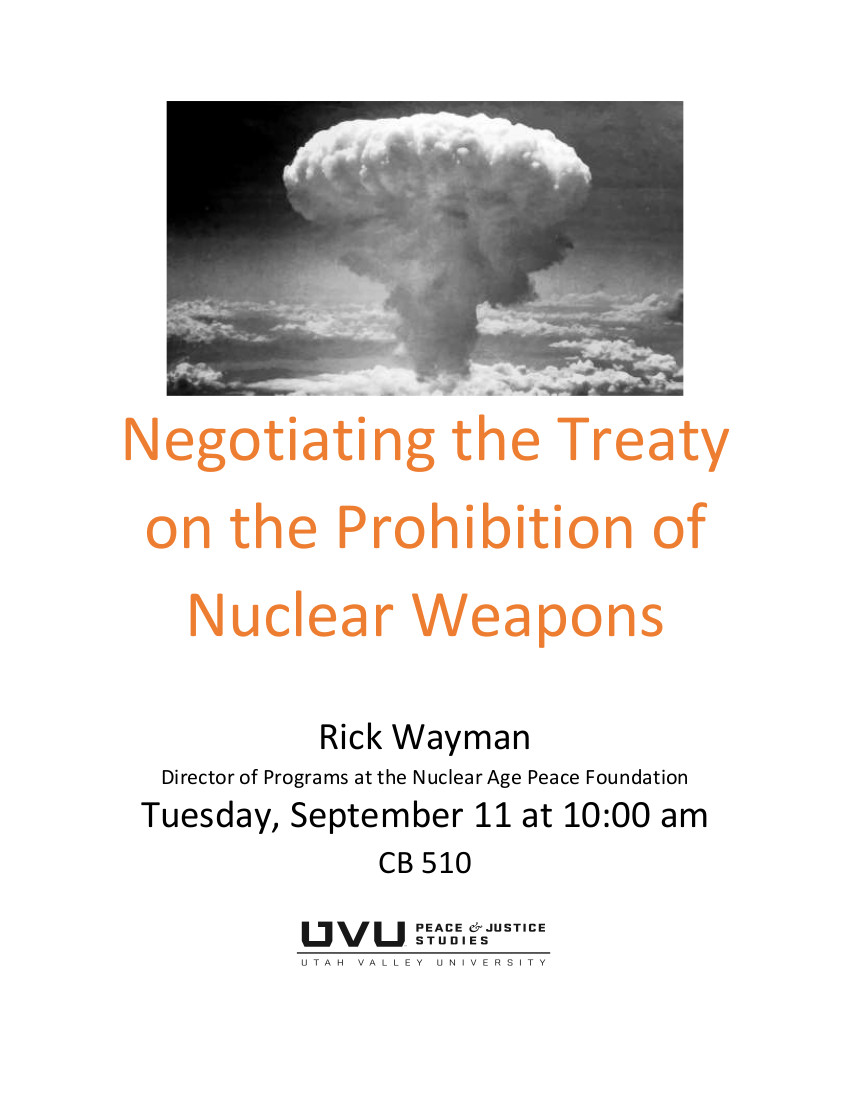The Utah Valley University (UVU) Peace and Justice Studies program hosted Rick Wayman, Director of Programs at the Nuclear Age Peace Foundation (NAPF), on September 11, 2018. During his presentation, Mr. Wayman discussed the international Treaty on the Prohibition of Nuclear Weapons and how the treaty was devised, the prohibitions within the document and the positive obligations that accompany it, and the future of the United States’ involvement with the disarmament of nuclear weapons.