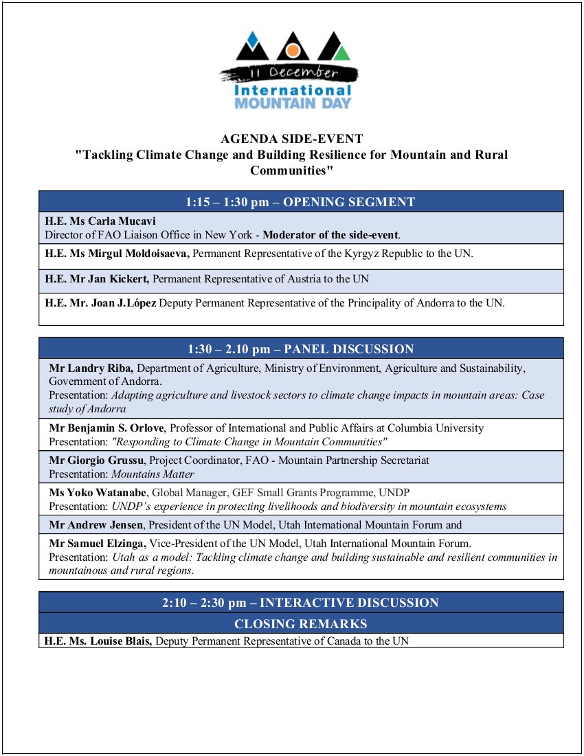 At the event, we joined the PR of the Kyrgyz Republic to the UN, Ms. Moldoisaeva, the PR of Austria to the UN Mr. Jan Kickert, the Deputy PR of Andorra to the UN, Mr. Joan J. Lopez, and Deputy PR of Canada to the UN, Ms. Louise Blais. The event was moderated by H.E. Ms. Carla Mucavi, who is the Director of the FAO Liaison Office in New York. Each country had the opportunity to address the topic of sustainable mountain development. H.E. Ms. Mirgul Moldoisaeva, the PR from the Kyrgyz Republic, was the first to address the gathered group, highlighting that because 95% of the country is mountainous they are highly invested in the process of sustainable developing those mountainous regions. She mentioned the various programs and conferences that the Kyrgyz Republic has worked on to promote Sustainable Development of Mountains. Next, the PR of Austria to the UN, H.E. Mr. Jan Kickert, had the opportunity to address the assembled delegation. He highlighted that Austria too is a stakeholder in the mountain process, referencing statistics that show glacier retreat in Austria has accelerated form 1% in the mid-20th century to 2-3% at the current rate. This double and triple rate increase means that half of the glaciers in Austria will soon be gone. This affects both mountainous communities and their downstream counterparts. Following him, the DPR of the Principality of Andorra to the UN, H.E. Mr. Joan J. Lopez, addressed the delegation. He highlighted that Andorra, as a small country that has a minimum elevation of 2000 feet, is entirely mountainous. He referenced Andorra’s recent shift to sustainability as an indicator of future opportunities for growth. Following the PRs and DPRs, the panel of assembled experts had the opportunity to address the delegation.
