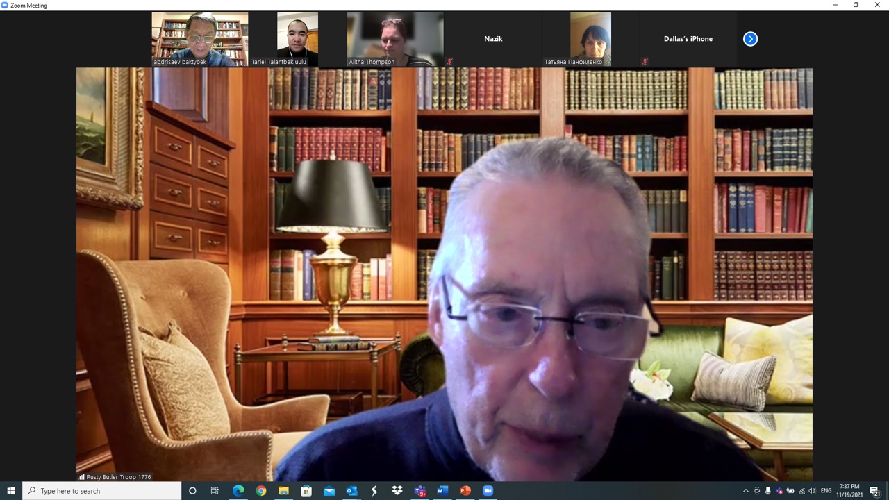 On 20 November, 2021, the following persons from OshTU participated in the meeting: Tariel Talantbek uulu and Tatiana Panfilenko as faculty and Nazik and I as students. Dr. Almaz Atabekov wasn’t able to join us this time. From UVU the following individuals participated: Dr. Baktybek Abdrisaev as a faculty who was joined for the first time by Dr. Rusty Butler and Alitha Thompson and Dallas Karren as a students and leaders of the UIMF. The main focus of the meeting was to identify the names of the speakers of IMD 2021 at UVU from the OshTU.